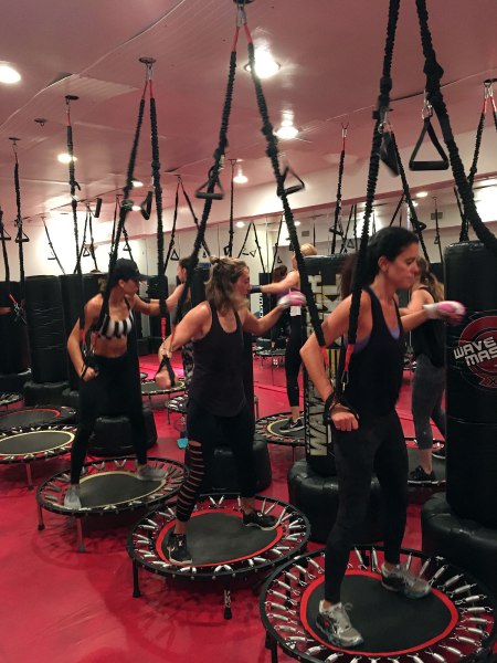 As I walked to my designated space, which featured a small trampoline, black punching bag and resistance bands that hung from the ceiling, I met co-class member Shannon, a Spiderbands devotee — “I come five times a week because I love it” — who answered all my questions and helped strap me in and out of the bands.